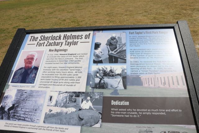 Howard England, along with his volunteer “sand hogs”, worked tirelessly for eight long years to unearth the treasures on Fort Taylors grounds.  When all was said and done, enough fill and rubble to fill approximately 3,300 semi trailer trucks uncovered 20 large guns, their carriages, and thousands of rounds of ammunition.  One of the placards stated:  “When asked why he devoted so much time and effort to his one-man crusade, he simply responded, ‘Someone had to do it.’ ”