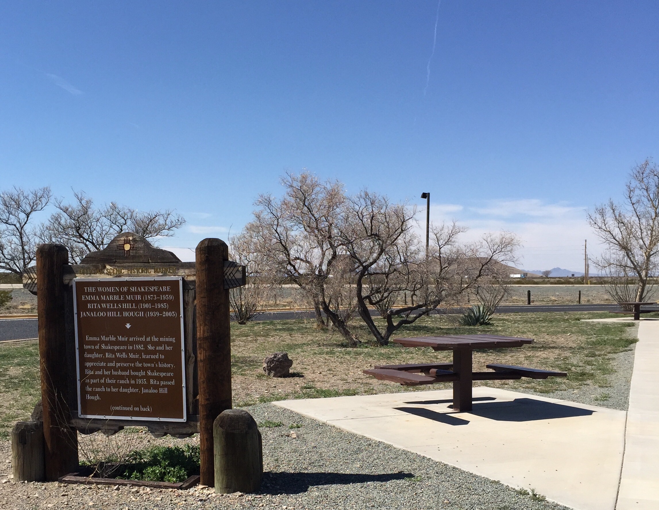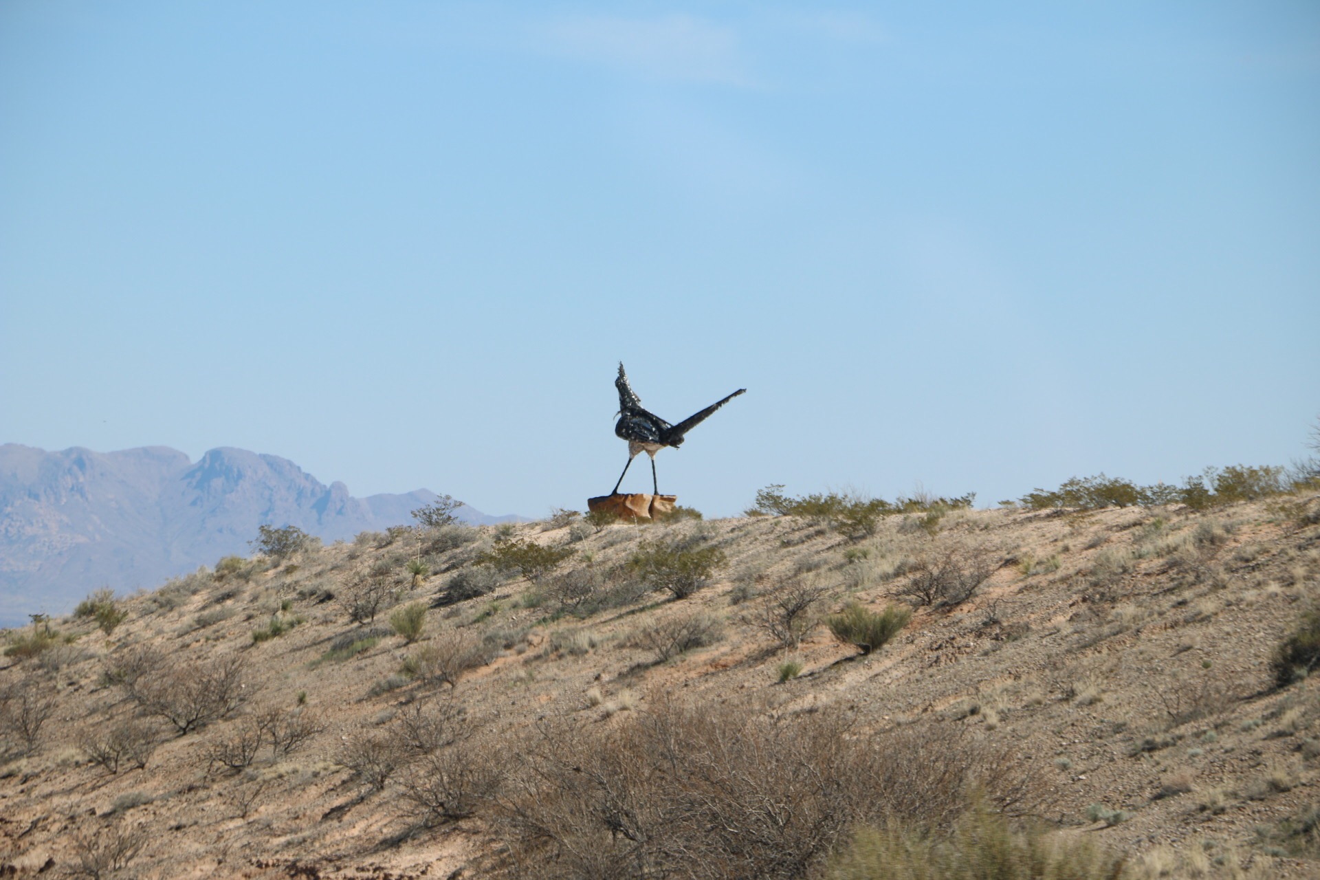 We’ve traveled this route several times.  There’s a brief drive through New Mexico, where we usually find a nice rest stop to have a picnic lunch, this trip being no exception.  New Mexico has the prettiest rest stops in the west, with sculptures, architecture and paint designs all reflecting the Southwest heritage.  After tossing the birds leftover bread crusts, we hit the road towards El Paso, then ultimately, Van Horn, Texas for the night.