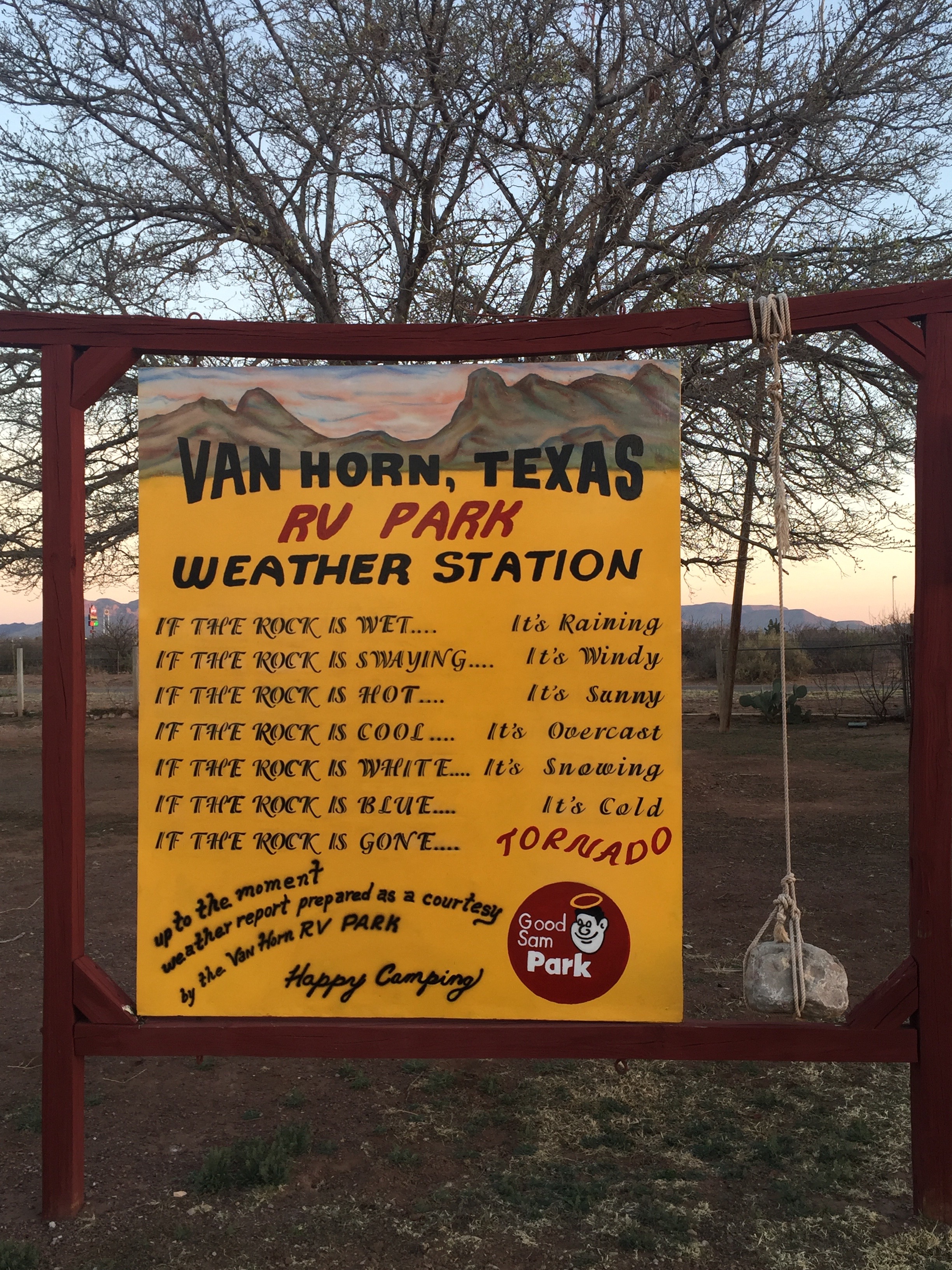 There are a few RV parks in Van Horn to choose from, but we always stay at the same one every single time.  Van Horn RV Park used to be a KOA park, and a few years ago it became an independent park, approved by Good Sam.  Not much to look at, but the folks here are always friendly, and there’s a little on-site market if you need ice or the bare necessities.